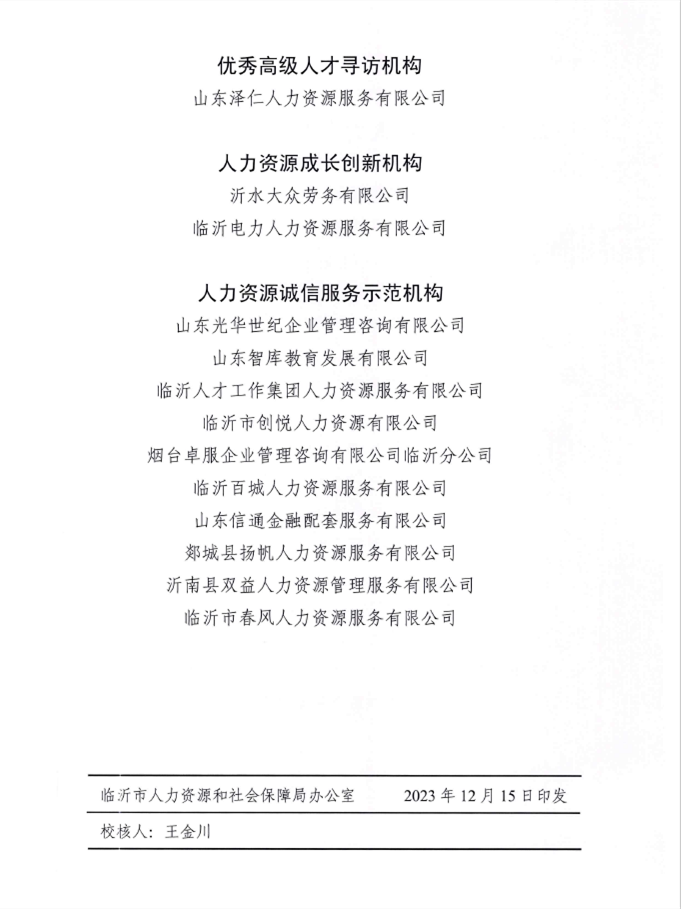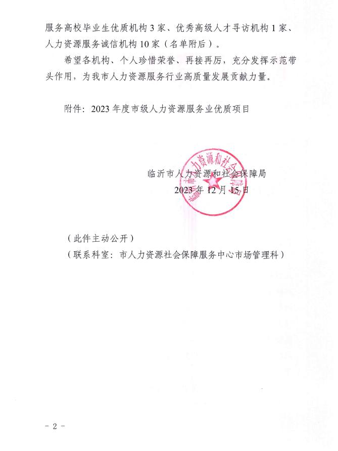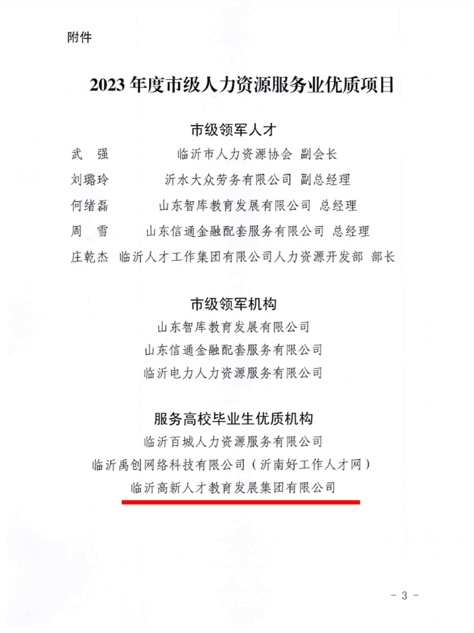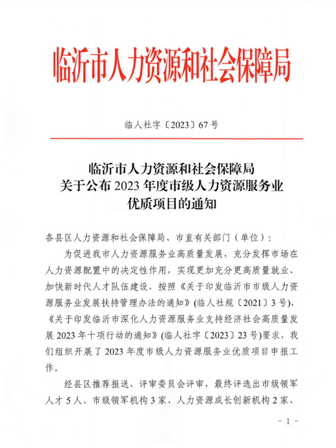 近日,临沂市人力资源和社会保障局公布了《2023年度市级人力资源服务业优质项目》名单,临沂高新人才教育发展集团获评“临沂市服务高校毕业生优质机构”称号。