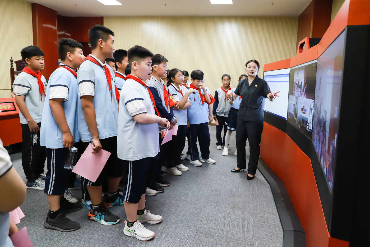 5月30日,恰逢第74个“六一”儿童节来临之际,为加强未成年人普法宣传,深入落实校园安全司法先议工作,临沂高新区法院邀请高新区实验小学、黄堰小学师生代表40余人走进法院,“沉浸式”体验法院工作,“零距离”接受法治教育。临沂高新区群团办、教体办、高新区实验小学、黄堰小学等相关领导受邀参加活动,临沂高新区法院副院长张涛陪同。 “心贴心”交流 同学们首先来到临沂高新区家庭教育指导站,法院普法志愿者李珍向同学们介绍了家庭教育指导站的功能和作用,家庭教育指导站派驻法官解读了《家庭教育促进法》的基本内容。随后,同学们来到高新区城市书房,与法院干警董凤阳一起品读《假如给我三天光明》。董凤阳通过海伦凯勒、李白、苏轼、陶渊明等名人的例子,阐释了家庭教育和读书的重要性,引导同学们树立正确的世界观、人生观、价值观,养成读书好习惯和乐观豁达的心胸。 “沉浸式”体验 同学们来到高新区法院,先后参观了安检通道、诉讼服务中心、调解室、审判法庭、诉调对接指挥中心等场所。参观过程中,同学们积极参与体验,在安检通道,法警们详细介绍了安检设备和警用器械的作用和使用方法,同学们踊跃上前体验,有的拿起警棍,有的拿起盾牌,有的拿起检测仪,三五成群地向法警请教学习。在审判法庭,普法志愿者向同学们介绍了审判庭的设置、功能、庭审程序,在庄严的国徽下,同学们纷纷化身审判长、审判员、书记员、公诉人、辩护人等角色,亲身体验庭审过程,切身了解诉讼程序,深刻感受到了法律的庄严和神圣。 “零距离”学法 在法治图书角,同学们围坐一圈,在唐靖法官的带领下,以饱满的热情,逐字逐句诵读着民法典的重要篇章。那朗朗的诵读声是法治精神的传递,激发了同学们学法、守法、用法的热情。在大会议室,林蕾庭长等发放了“爱心联系卡”,告知同学们当遇到校园欺凌或者法律问题,可以通过“爱心联系卡”与联系法官沟通。普法志愿者王雨晴围绕“预防校园欺凌”和“防溺水”等主题,用生动的语言和真实的案例,为同学们上了一堂专题法治教育课。最后,同学们和普法志愿者共同唱起《我们是共产主义接班人》,本次活动画上圆满句号。 下一步,临沂高新区法院将以“三强三优”专项活动为抓手,以“法伴‘未’来 向阳花开”品牌建设为着力点,探索通过法院开放日、普法进校园等形式,拓展普法形式,丰富普法内容,加大未成年人司法保护力度,努力将“法治”的种子播撒的更深更广,引导未成年人用法律严格约束、规范自己的言行,系好人生第一粒扣子。