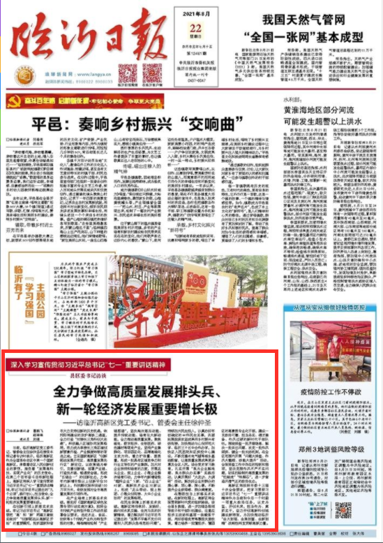 日前,临沂高新区党工委书记、管委会主任徐仲圣在接受本报记者专访时表示,临沂高新区作为全国革命老区中第一个国家高新区,承载着老区人民创新创业的梦想,肩负着“发展高科技、实现产业化”的历史使命。在第二个百年奋斗目标新征程上,高新区将深入学习宣传贯彻习近平总书记“七一”重要讲话精神,牢记习近平总书记提出的“九个必须”,践行初心,担当使命,全力争做高质量发展排头兵、新一轮经济发展重要增长极。