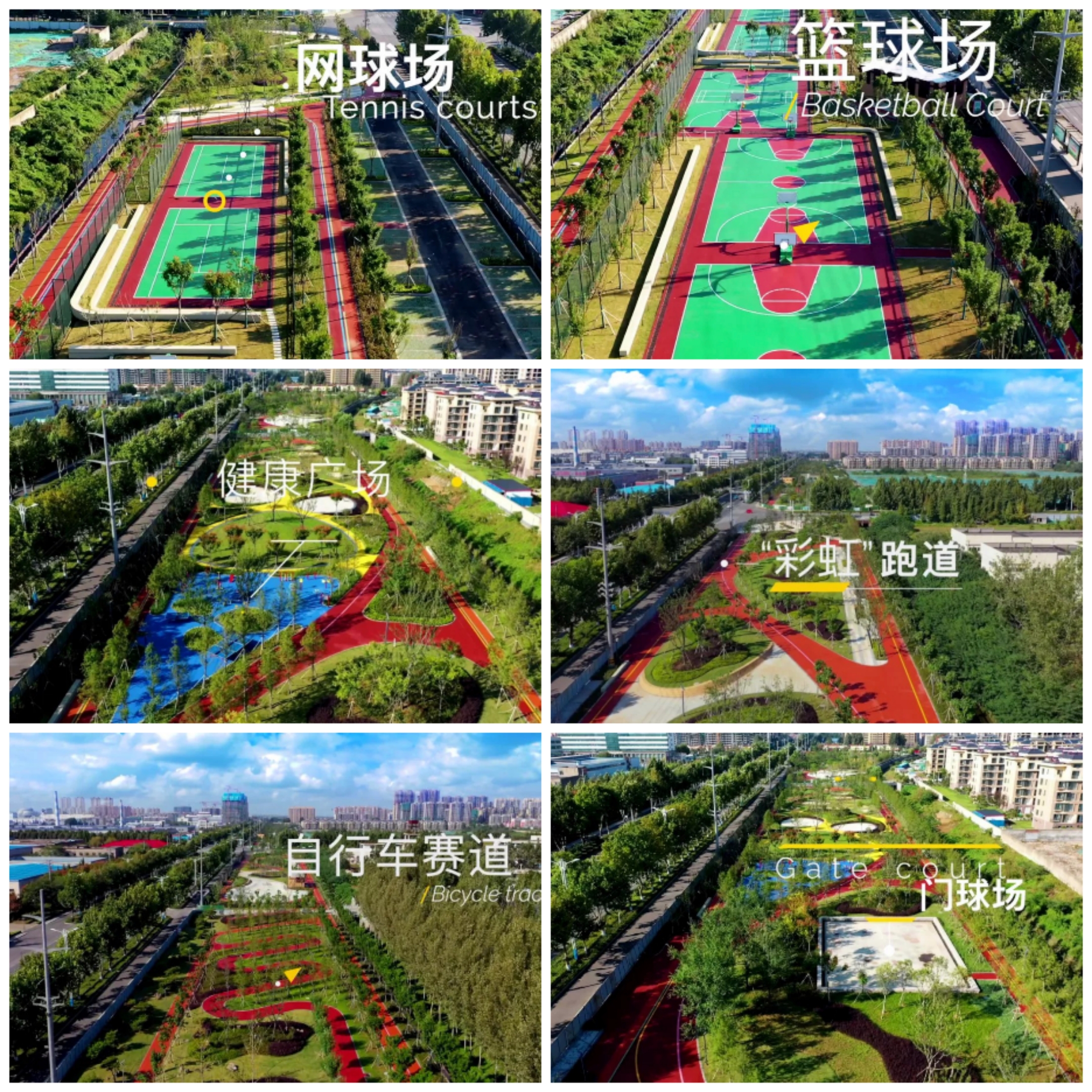 主要建设了4处标准篮球场,2处标准网球场,1处5人制足球场,3处羽毛球场,1处标准门球场,乒乓广场,极限运动场地,自行车竞技跑道,彩虹跑道,休闲广场,亲水平台,气泡湿地等体育休闲设施。